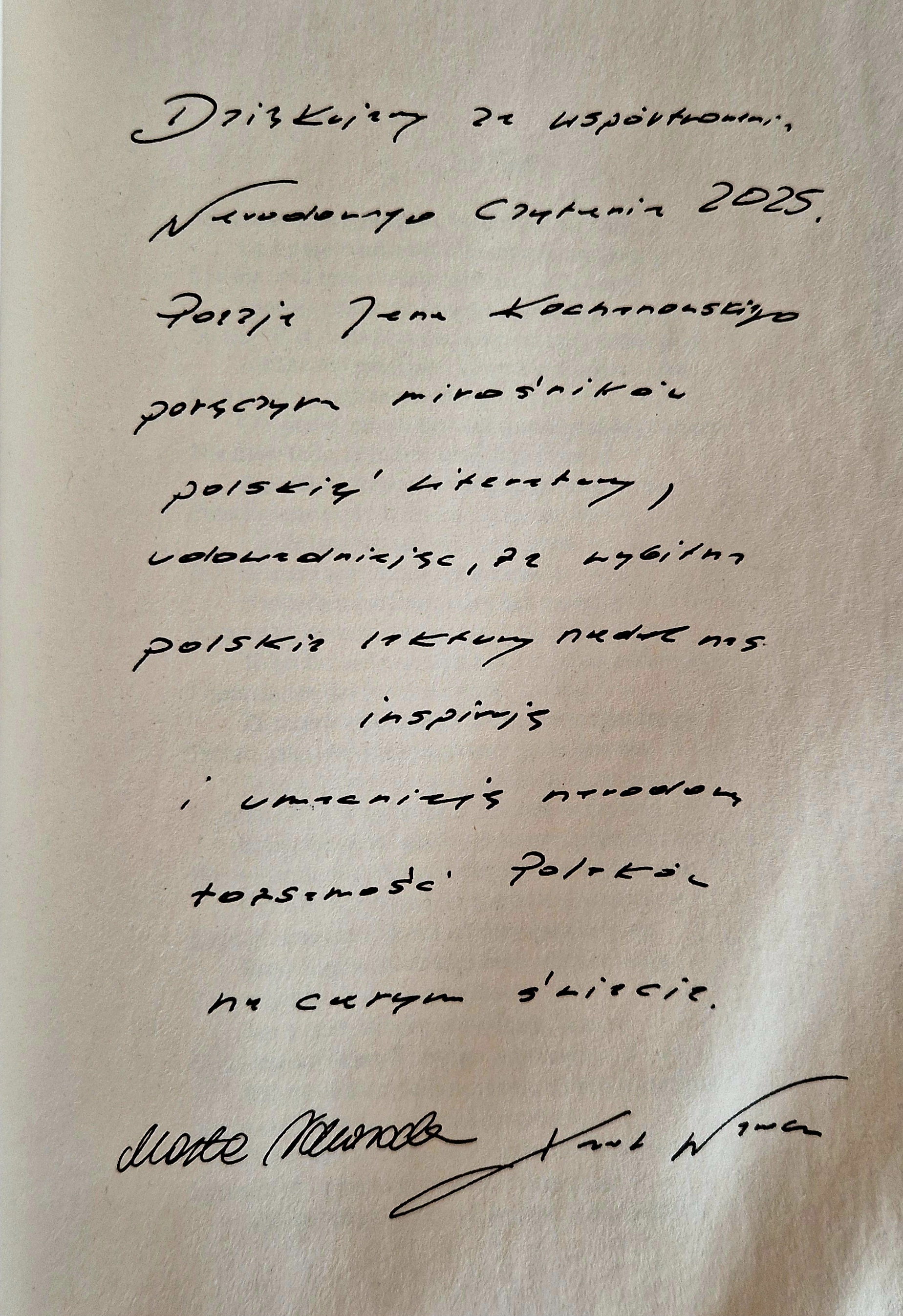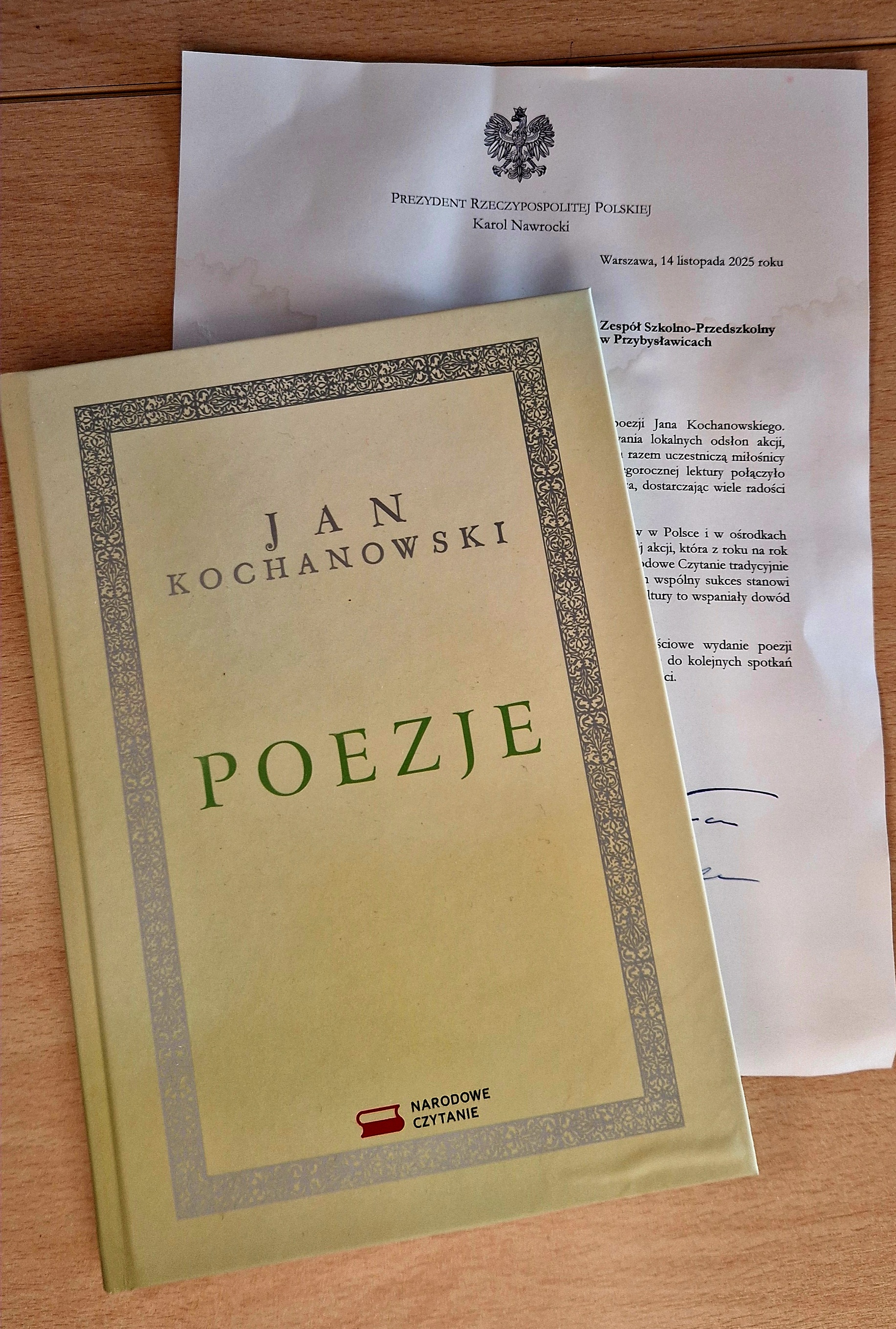 W okresie świątecznym otrzymaliśmy podziękowania i życzenia od Pary Prezydenckiej za udział naszej szkoły w kolejnej edycji Narodowego Czytania poezji Jana Kochanowskiego. Do podziękowań dołączono okolicznościowe wydanie książki z utworami Jana Kochanowskiego. Zasili on naszą biblioteczną kolekcję pamiątkowych publikacji związanych z akcjami organizowanymi wokół polskich lektur. (zk)